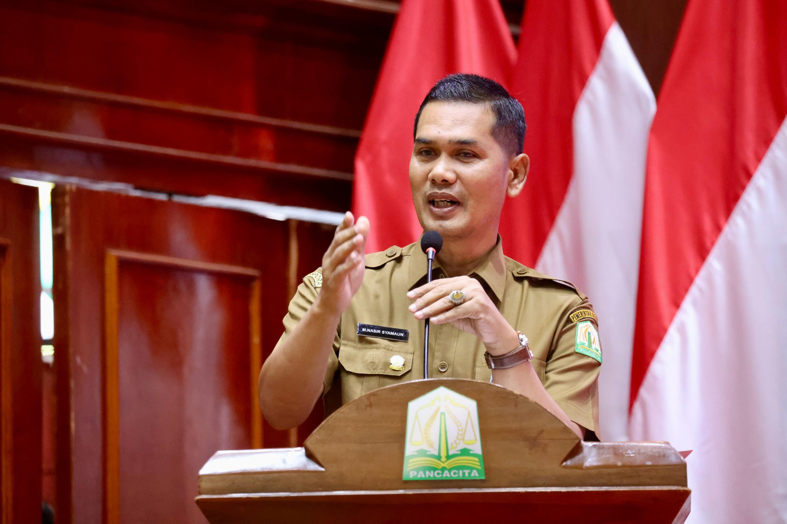 Plt Sekda Aceh, M. Nasir S.IP, MPA, memberi sambutan sekaligus meluncurkan Portal Satu Data Aceh, di Anjong Mon Mata Mueligoe Gubernur Aceh, Selasa, 29/4/2025.