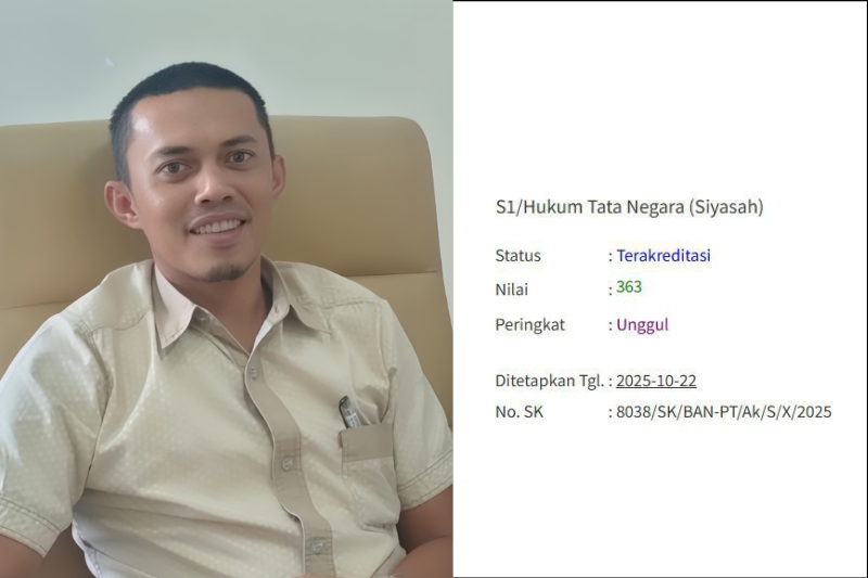 Acehconnect.com | Banda Aceh — Program Studi (Prodi) Hukum Tata Negara (HTN/Siyasah) Universitas Islam Negeri (UIN) Ar-Raniry Banda Aceh, resmi meraih akreditasi “Unggul” dari Badan Akreditasi Nasional Perguruan Tinggi (BAN-PT), setelah sebelumnya berstatus “Baik Sekali.” Pencapaian itu ditetapkan berdasarkan SK BAN-PT Nomor 8038/SK/BAN-PT/Ak/S/X/2025 tertanggal 22 Oktober 2025 dengan nilai 363.
