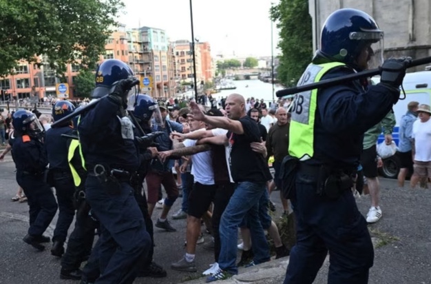 Aktivis sayap kanan bentrok dengan pengunjuk rasa menyusul serangan penikaman di Bristol, Inggris, Sabtu (3/8/2024). Foto: Justin TALLIS / AFP