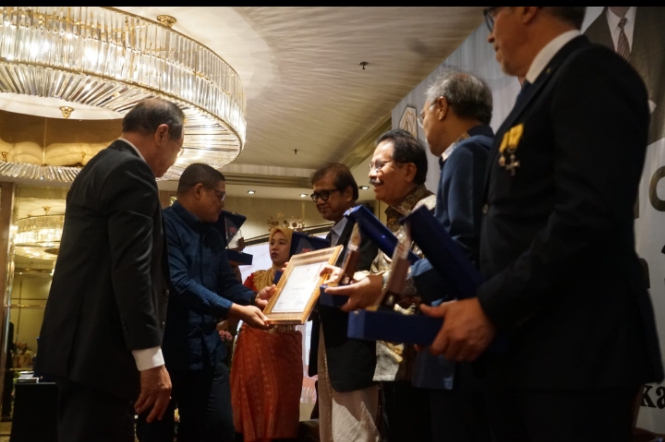 Kepala BRA menyerahkan cinderamata kepada Mantan Menteri era Presiden Soeharto, Abdul Latief pada acara Diaspora Global Aceh di Aula Hotel Ambhara, Jakarta Selatan, Rabu, 20 Agustus 2025. (Foto: Humas BPPA).