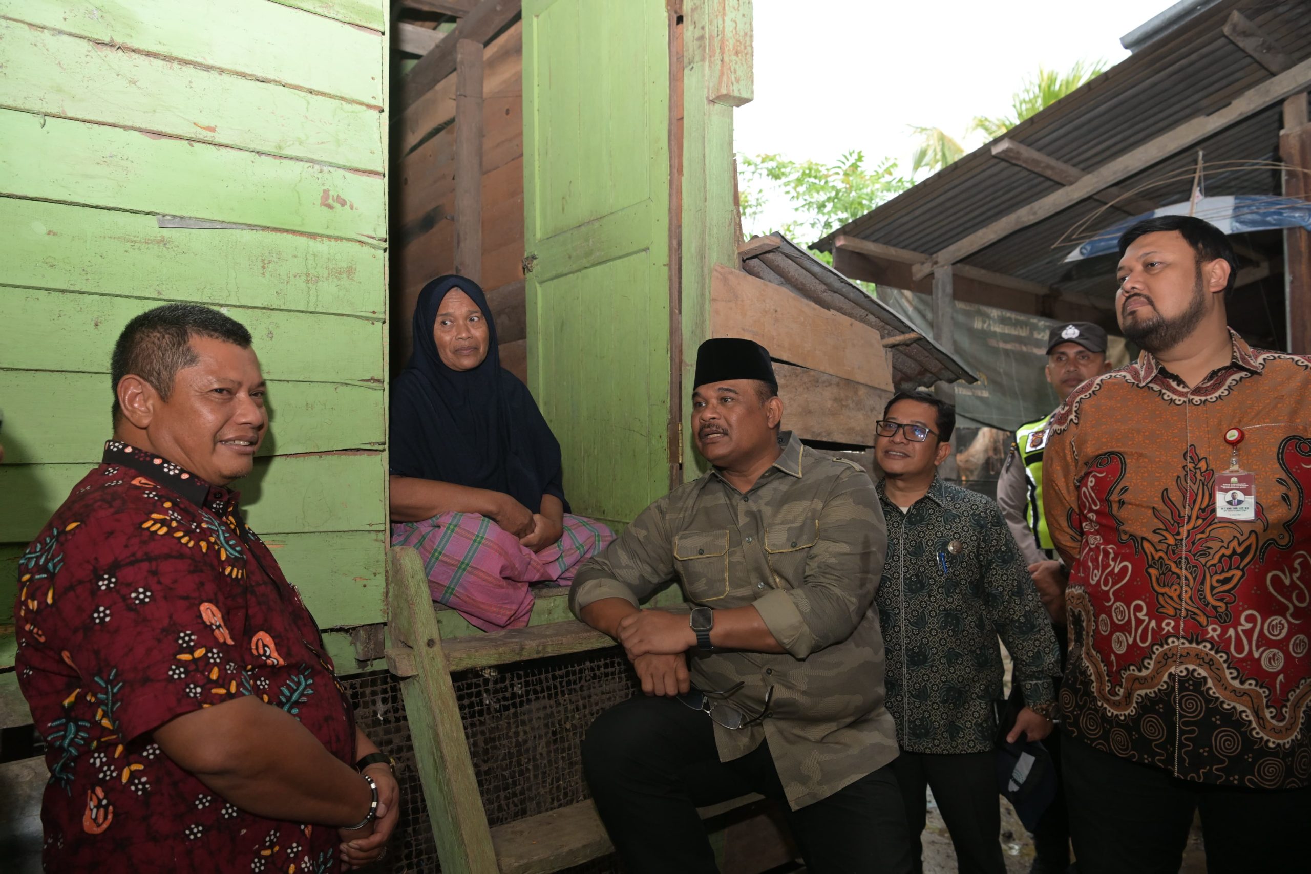 Di Lampoh Keude. Pj Gubernur meninjau rumah Asma (54). Perempuan paruh baya yang kesehariannya berjualan sayur di Pasar Lamdingin menjadi salah satu calon penerima RLH yang diverifikasi langsung oleh Pj Gubernur Aceh.