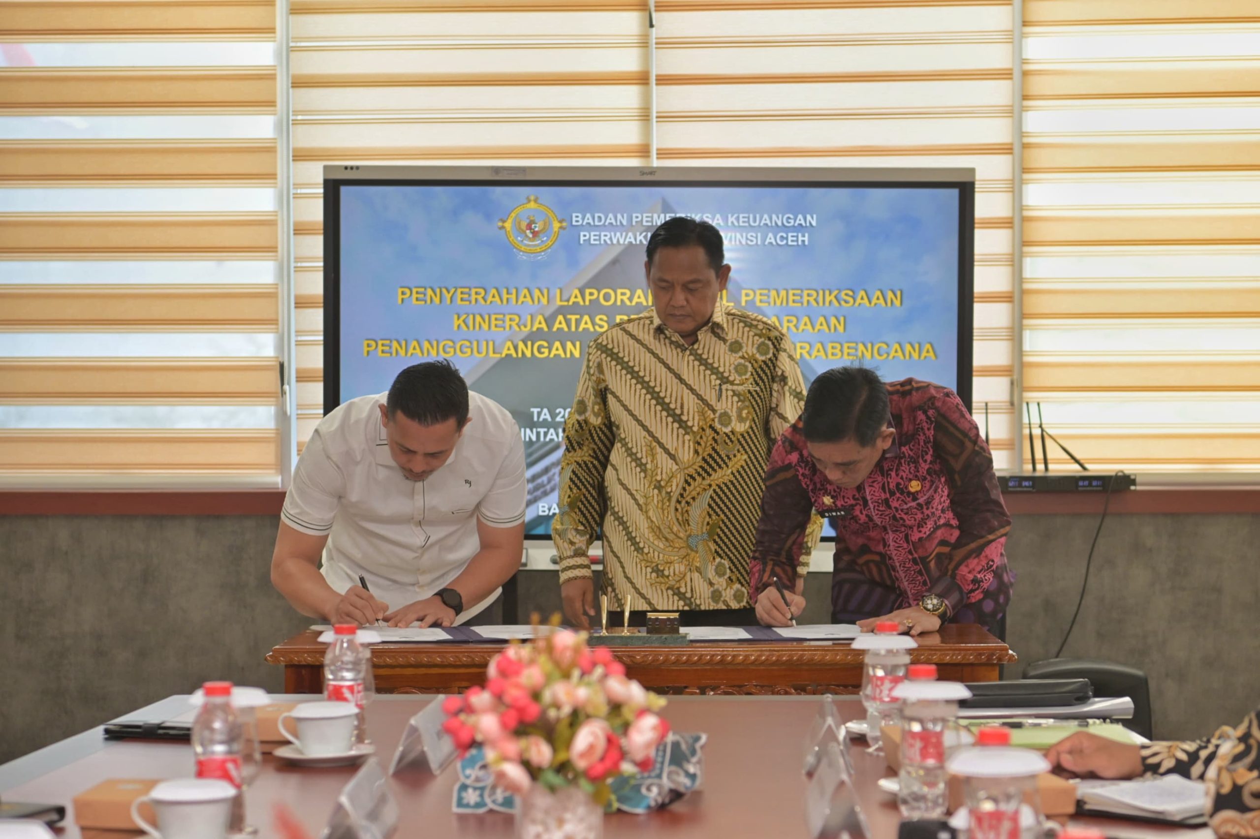 Aceh Connect | Banda Aceh. —– Plt Sekda Aceh Muhammad Diwarsyah menerima Laporan Hasil Pemeriksaan (LHP) yang diserahkan oleh Kepala Badan Pemeriksa Keuangan (BPK) Perwakilan Provinsi Aceh Triyantoro pada Jumat (3/1) di Kantor BPK Perwakilan Provinsi Aceh di Banda Aceh. Acara ini dihadiri oleh Ketua Komisi V DPR Aceh, Sekretaris DPR Aceh, Sekretaris Badan Penanggulangan Bencana Aceh serta sejumlah pejabat terkait lainnya.
