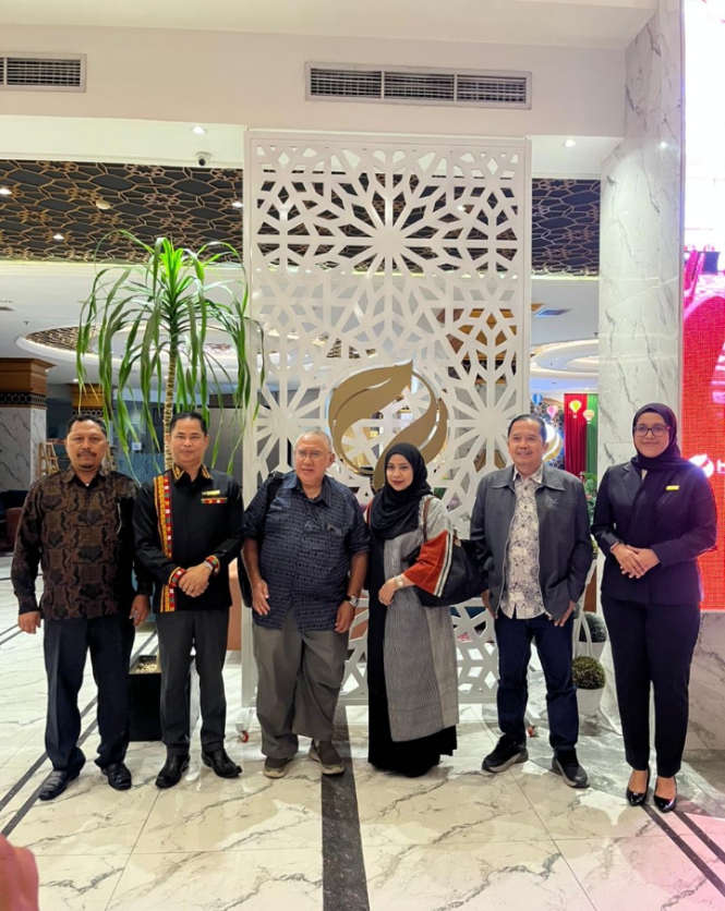 Ketua Umum Serikat Perusahaan Pers (SPS) Pusat Januar P Ruswita dan rombongan foto bersama dengan ketua SPS Aceh saat tiba di Hotel Hermes Palace, Banda Aceh, Minggu (19/10/2025) malam. Foto: Dok SPS Aceh.