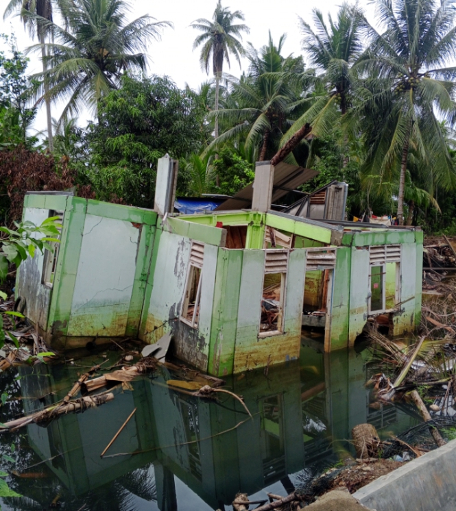 Di sebuah sudut perkampungan di kecamatan Lapang Aceh Utara, Gampong Matang Baro. Tidak terlihat banyak bangunan yang rusak karena semuanya sudah dihempas, disedot ke laut, hanya beberapa rumah yang tersisa dalam kondisi miring tanpa pondasi lagi, atapnya tertimpa pohon kelapa.