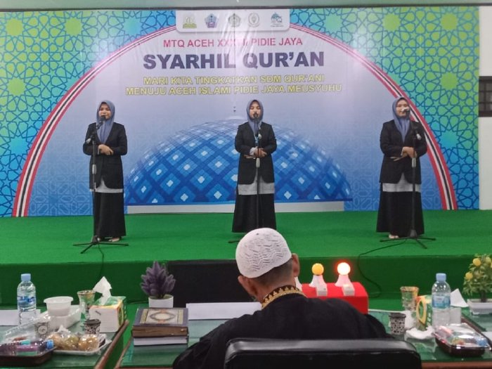 Tampilan peserta cabang Syarhil Qur’an Putri Aceh Besar pada MTQ ke-37 Tingkat Provinsi Aceh di Gedung MPU Pidie Jaya, Senin, (03/11/2025)/FOTO/MC ACEH BESAR