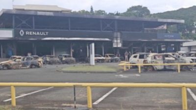 Foto: Pemandangan mobil-mobil yang terbakar di ruang pamer, di tengah protes yang dipicu oleh kemarahan…