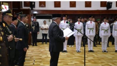 Pj. Gubernur Aceh, Bustami, SE, M. Si saat mengukuhkan Pasukan Pengibaran Bendera (PASKIBRA) Tahun 2024…