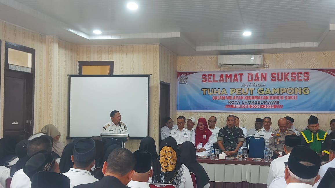 Lhokseumawe – Pemerintah Kecamatan Banda Sakti, Kota Lhokseumawe, melantik anggota Tuha Peut dari sejumlah gampong yang masa baktinya telah berakhir, Rabu (21/1/2026). Prosesi pelantikan berlangsung di Aula Kantor Camat Banda Sakti dan dipimpin langsung oleh Camat Banda Sakti, Mirda Ihsan, S.STP.